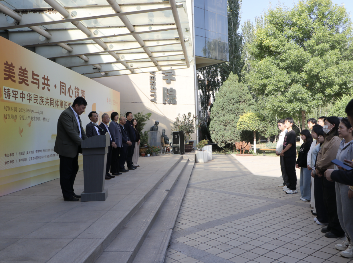 在全区民族团结进步月活动深入开展之际,为充分发挥艺术专业在思政育人中的独特作用,推动创作教学与价值引领深度融合,9月28日,由宁夏大学党委统战部、铸牢中华民族共同体意识研究院与美术学院共同主办、美术学院与宁夏本科院校铸牢中华民族共同体意识教育课程联盟承办的“美美与共·同心筑梦:铸牢中华民族共同体意识”主题美术作品展在校园正式拉开帷幕。校党委副书记韩惠丽,校党委常委、统战部部长朱学军等领导出席开幕式,美术学院党总支书记马树华、院长王胜泽、师生代表及相关部门负责人共同参加。开幕式上,朱学军部长与铸牢中华民族共同体意识研究院(民族与历史学院)常务副院长杨浣先后致辞,韩惠丽副书记宣布展览开幕。